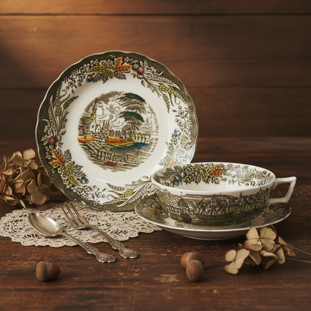 英国最古の陶器メーカーのひとつ、リッジウェイ社のカップアンドソーサー"Village of Cedars"。