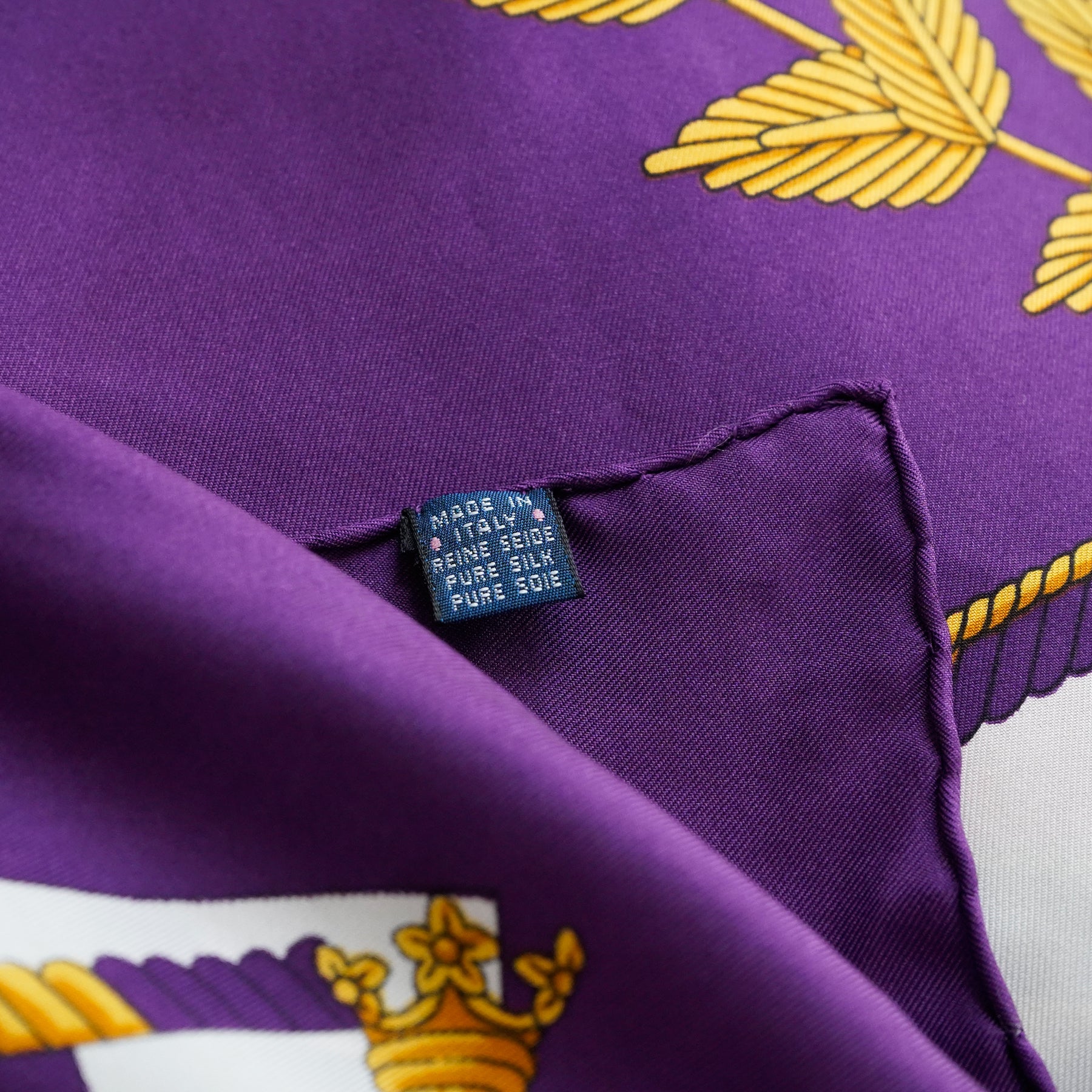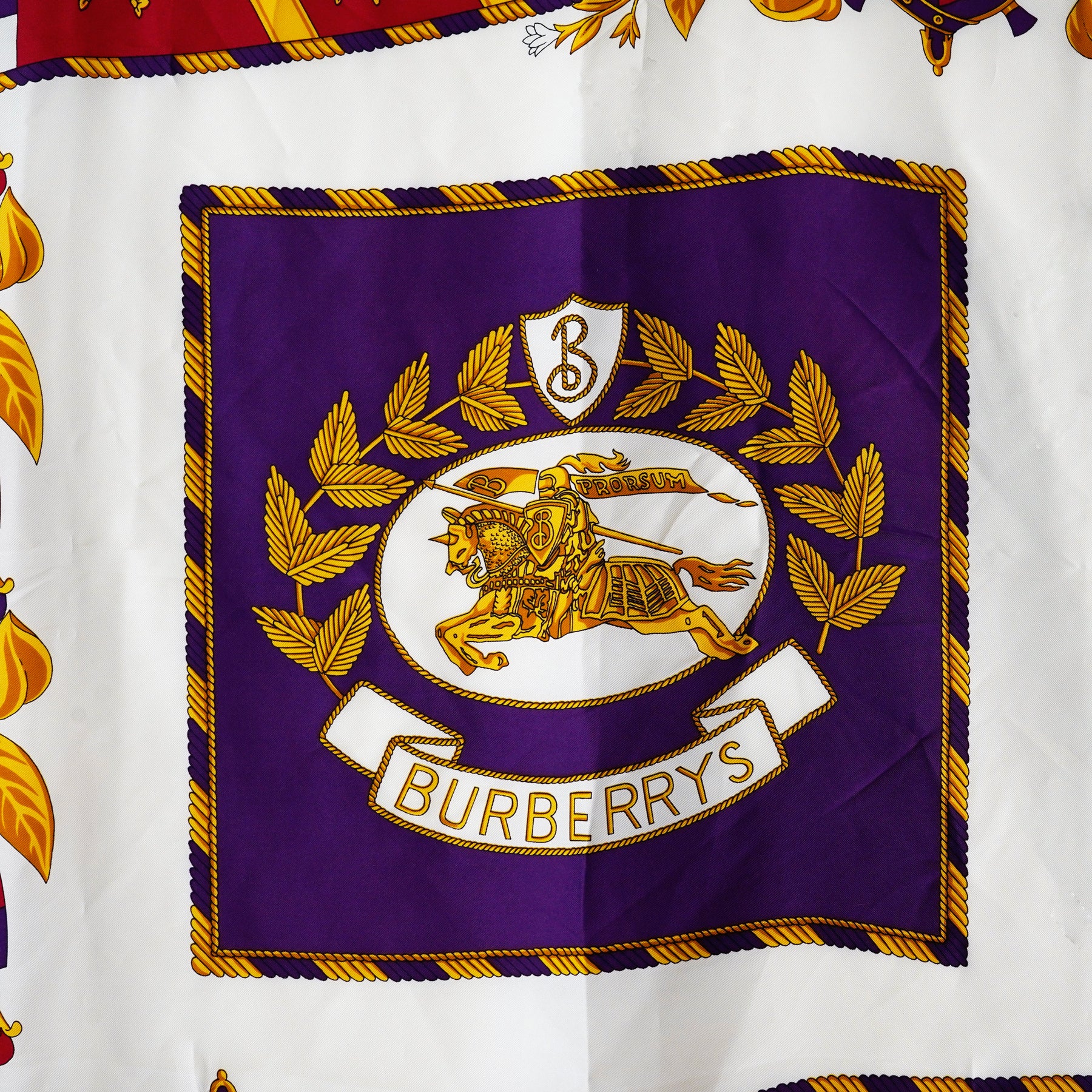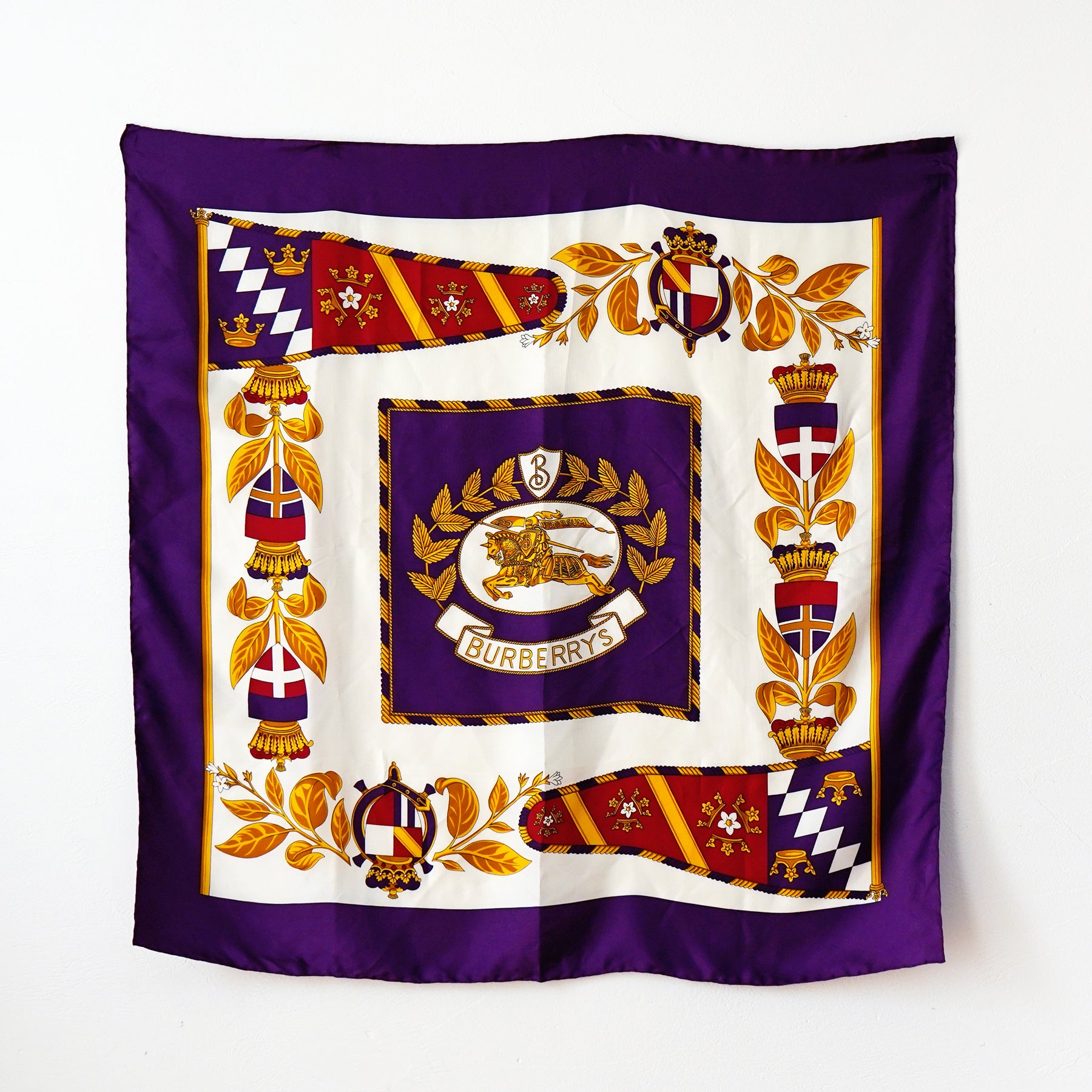 ヴィンテージバーバリーのシルクスカーフ。1980年代から1990年代頃のもの。中央にブランドの象徴的な馬上の騎士が描かれ、全体は紋章や植物をモチーフにしたイギリスらしいデザインです。 ロイヤルなパープルカラーも、クラシカルで印象的。