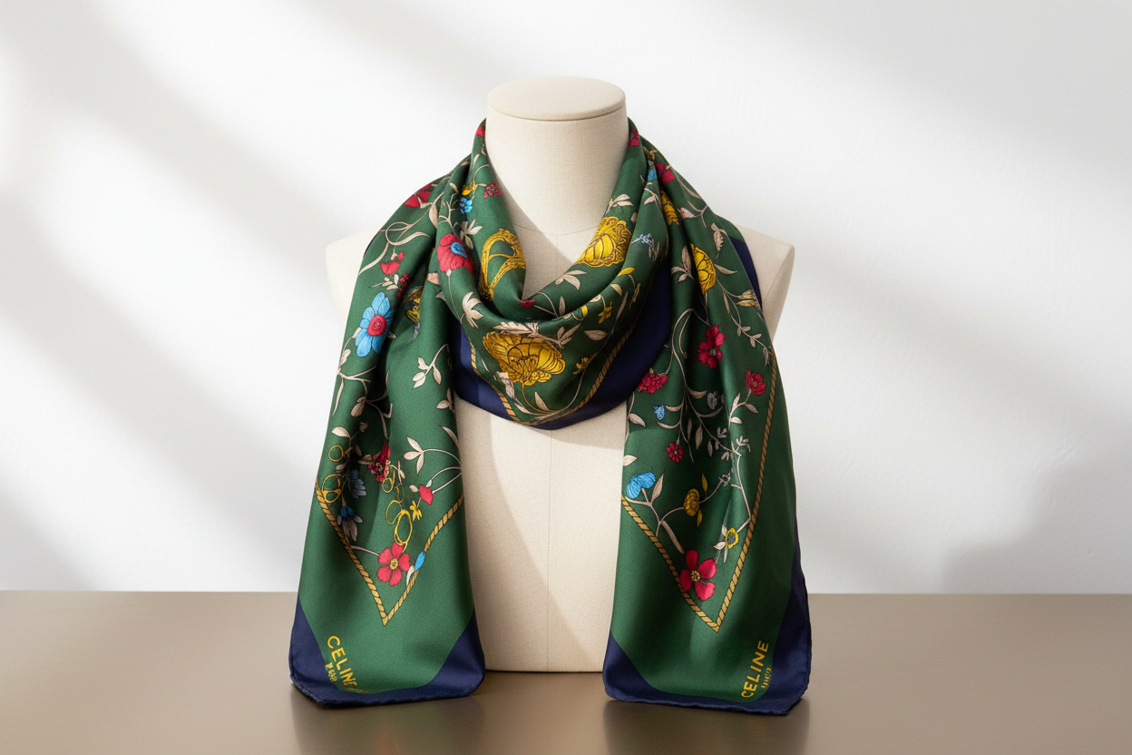 Vintage CELINE Silk Scarf / セリーヌ・シルクスカーフ "馬車と植物” (Navy & Green)