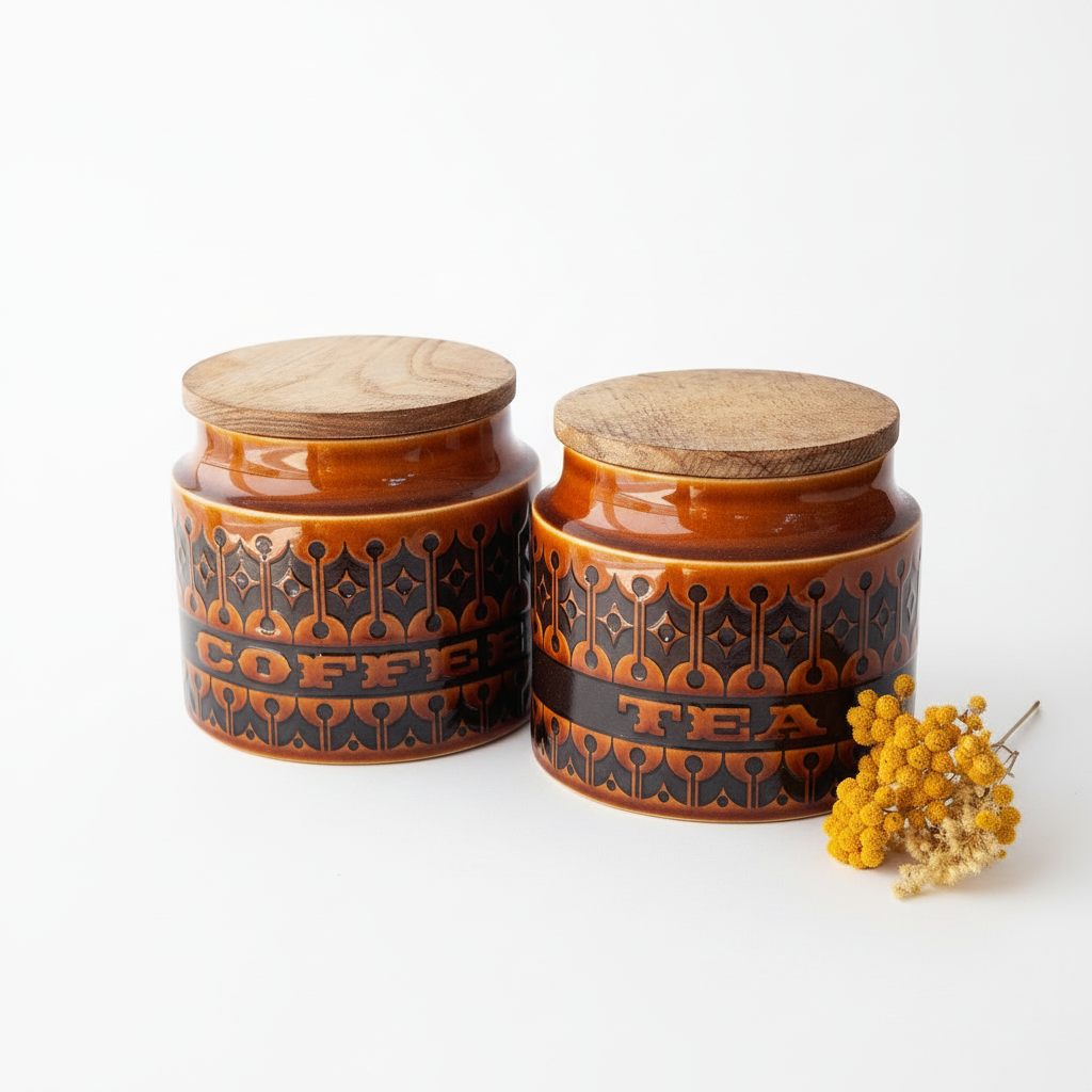 温かみのあるゴールデンブラウンの釉薬に、マットな黒の立体感のある幾何学模様。1960-70年代イギリス製、ミッドセンチュリーを象徴するスタイル、Hornsea(ホーンジー社)の人気デザイン『Heirloom』(エアルーム)シリーズのキャニスター。COFFEE & TEA。それぞれ別売りです。