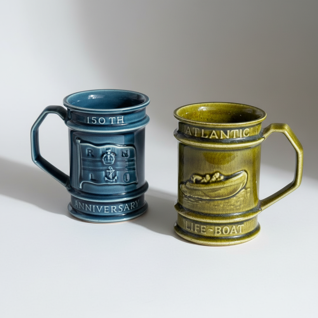 イギリス、ホルカムポッタリーが王立救命艇協会 (RNLI)の創立150周年のために手掛けた記念マグカップ。